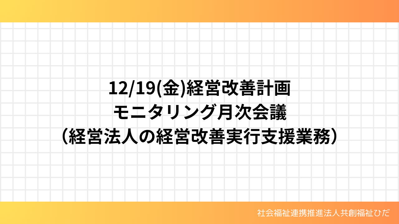令和7年12月19日(金)10時30から12時00分は吉城福祉会、13時30分から15時00分は神東会においてそれぞれの業務について12月の月次モニタリングを行いました。