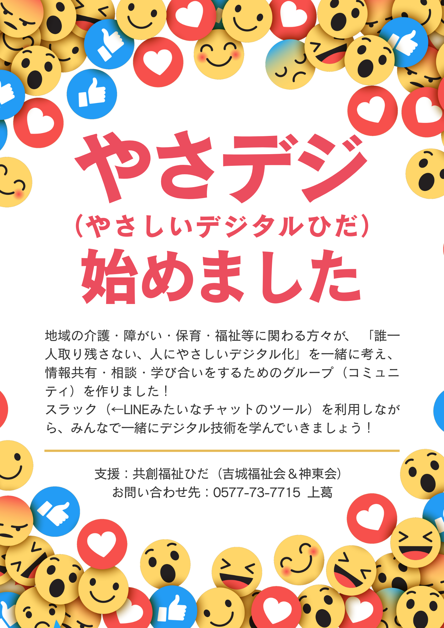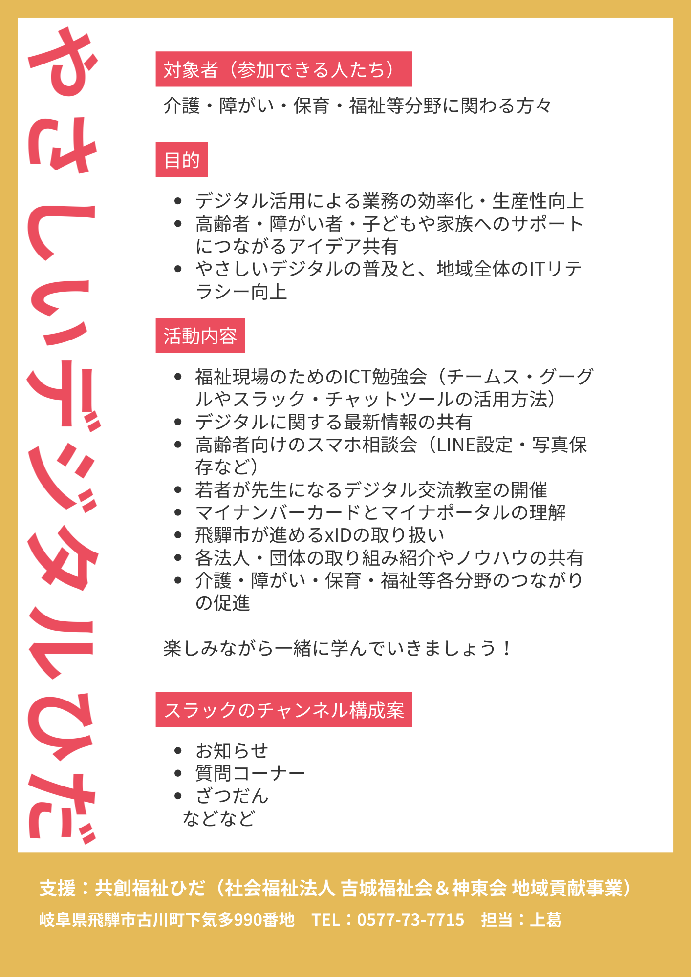 地域の介護・障がい・保育・福祉等(及び将来的には、教育・市民活動を含む)に関わる方々が、 「誰一人取り残さない、人にやさしいデジタル化」を一緒に考え、 情報共有・相談・学び合いをするためのコミュニティです。