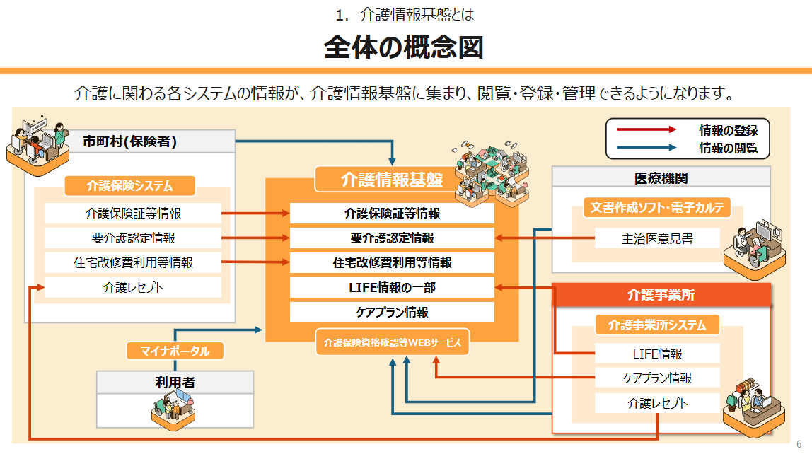 簡単に言うと、介護保険証や、要介護認定情報、ケアプラン情報などが一か所に集約され、利用者や介護事業所、医療機関などが情報を見られる仕組みですね。